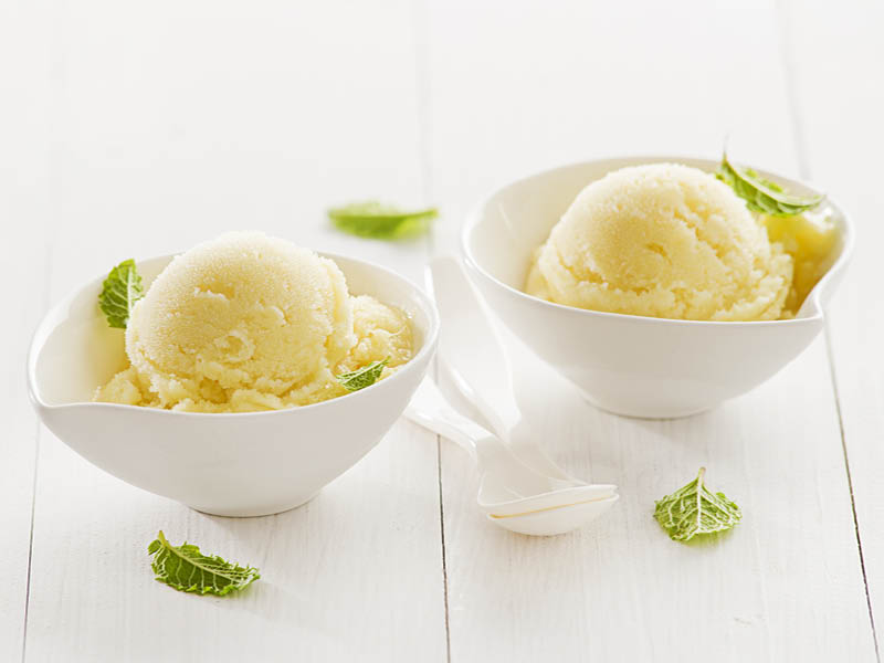 Sirva seu sorbet de limão caseiro e refrescante em taças ou cones. Você também pode decorar com algumas raspas de limão ou folhas de hortelã. 💚